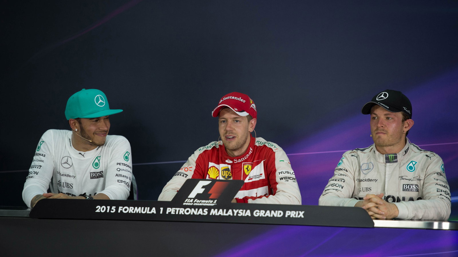 Drivers: Sebastian Vettel (Ferrari), Lewis Hamilton (Mercedes) and Nico Rosberg (Mercedes).