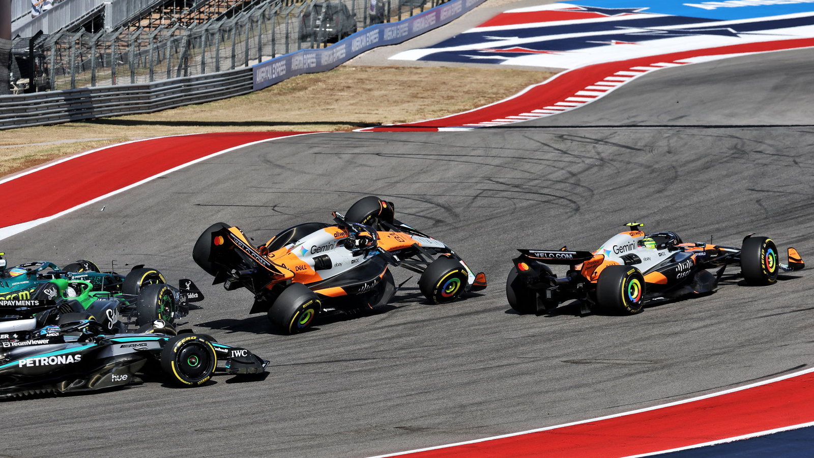Lando Norris and Oscar Piastri wiped out in first corner tangle.