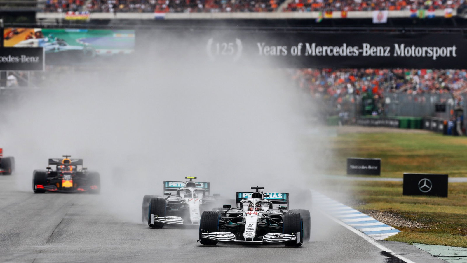 Heavy rain ahead of Sunday's race resulted in a number of laps being carried out behind the Safety Car, before drivers were ordered to form up on the grid as soon as track conditions were deemed safe enough.