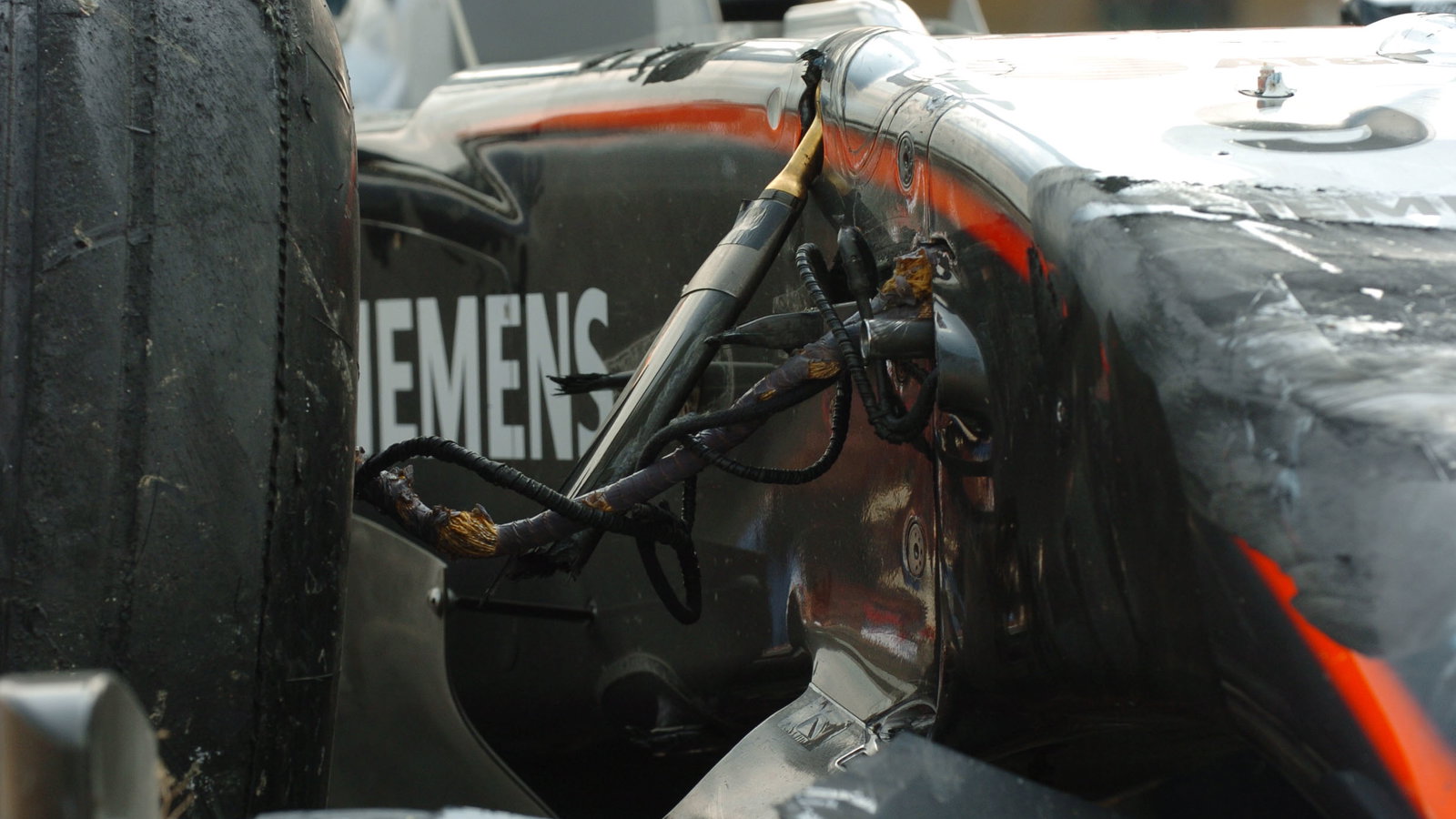 However, going into the final lap with a lead of 1.5 seconds, Raikkonen's suspension finally gave way, with a front wheel flapping around at the end of its tether as the McLaren spun, narrowly missed one of the BARs and buried itself in the turn one gravel - handing Alonso win number four of the season.
