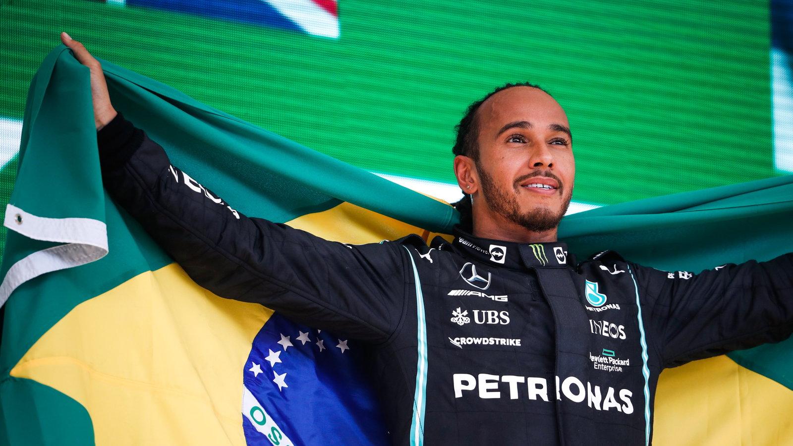 Hamilton merayakan kemenangan ketiganya di Interlagos dengan mengibarkan bendera Brasil dari mobilnya di putaran dalam dan sekali lagi di podium.