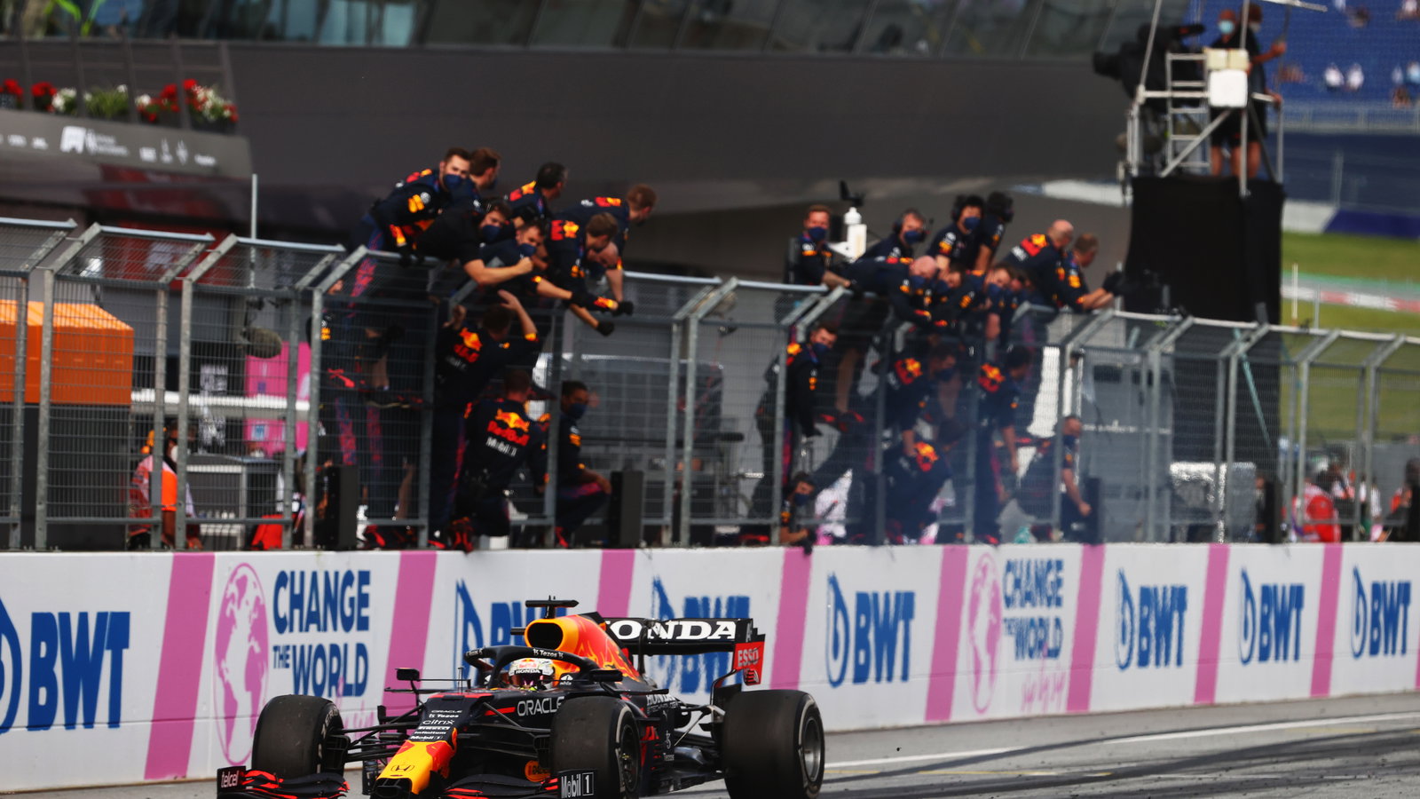 Setelah meraih kemenangan dominan keempat musim ini di Red Bull Ring, Max Verstappen melambat saat ia melewati garis untuk menyelesaikan sebuah perayaan di depan timnya di dinding pit.