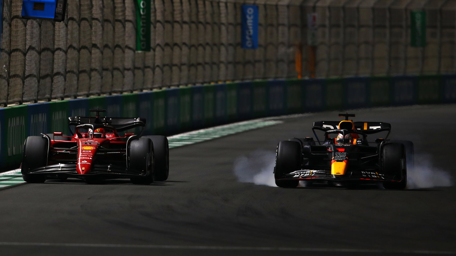 Verstappen dan Leclerc bertukar tempat saat mereka mencoba untuk saling mengakali di tikungan terakhir, dengan duo pada satu tahap sama-sama menderita lock-up saat mereka hampir berhenti total dalam upaya untuk memastikan mereka memiliki dorongan DRS di sepanjang trek lurus utama.
