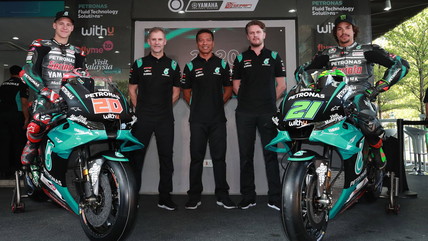Hanya berselang 30 menit dari peluncuran Monster Energy Yamaha, giliran skuad satelit Petronas Yamaha SRT memamerkan corak motor untuk MotoGP 2020 di Sepang, Kamis (6/2).