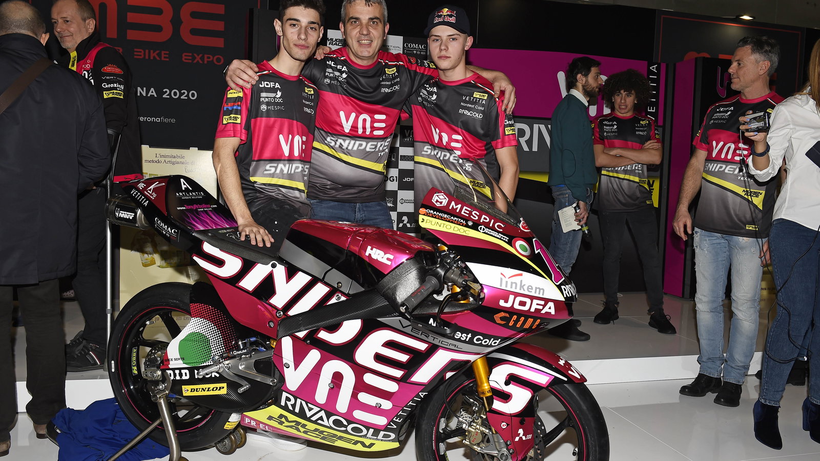 Arbolino bergabung dengan rekan setim baru Filip Salac, manajer tim Stefano Bedon, dan bos tim Mirko Cecchini untuk presentasi warna baru tim, di Motor Expo di Verona.