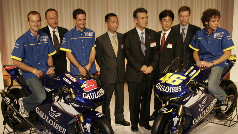 First pics: Yamaha unveils 2005 M1 livery. The new 2005-specification Gauloises Yamaha YZR-M1s were displayed for the first time in their new livery today (pictured), during a press conference attended by Valentino Rossi and Colin Edwards at the Imperial Hotel in Tokyo, Japan.