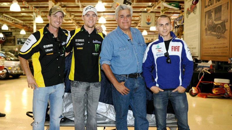 Yamaha stars visit Jay Leno's 'Big Dog Garage' On their way to Laguna Seca for this weekend's US Grand Prix, three of Yamaha's present MotoGP stars - plus some past champions - made a detour to the LA suburb of Burbank, home to Jay Leno's famous 'Big Dog Garage.'