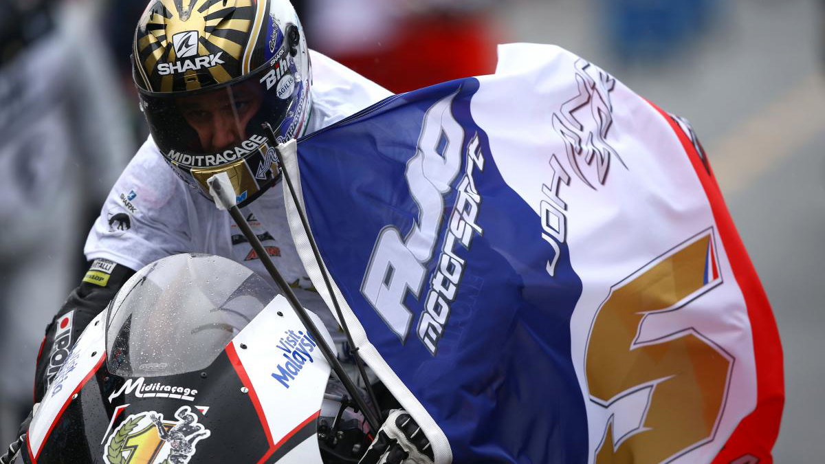 Johann Zarco celebrates his first race victory as world champion at a wet Motegi.