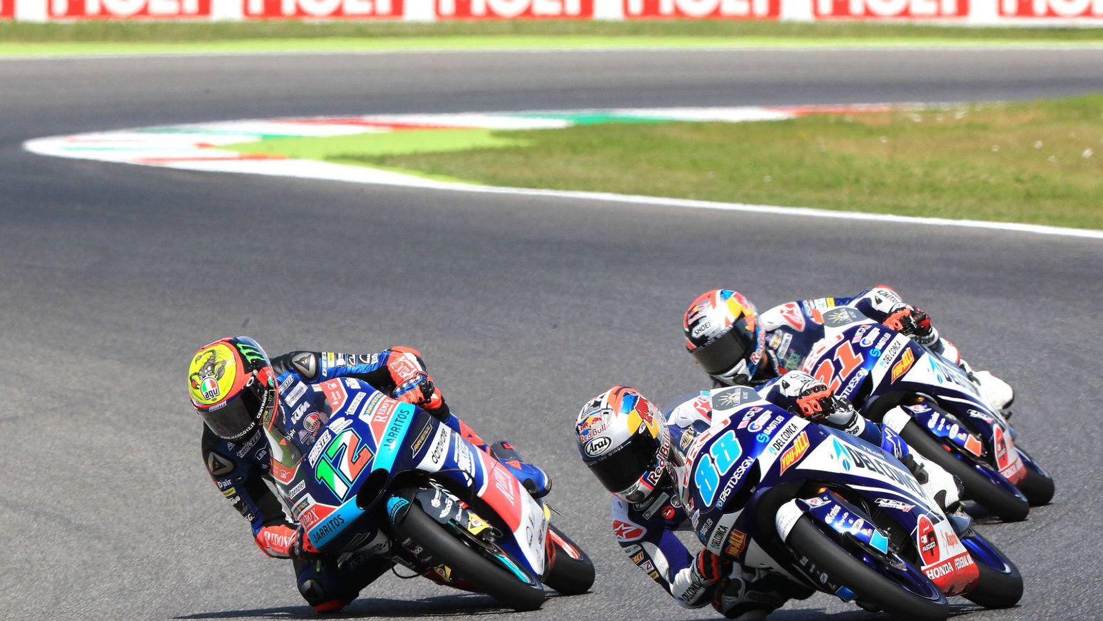 The Del Conca Gresini rider gave his team a home win by showing amazing skill and race craft after being passed at the end of the final lap every time in the lead group, so rode a wider line through the final sector on the last lap, which was just enough to prevent the slipstream efforts of both Marco Bezzecchi and Fabio Di Giannantonio.