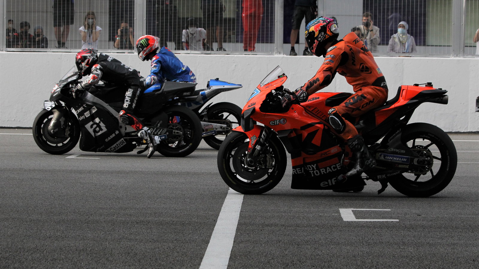 Binder's team-mate Andrea Dovizioso, on the 2022 Spec M1, and Aleix Espargaro.