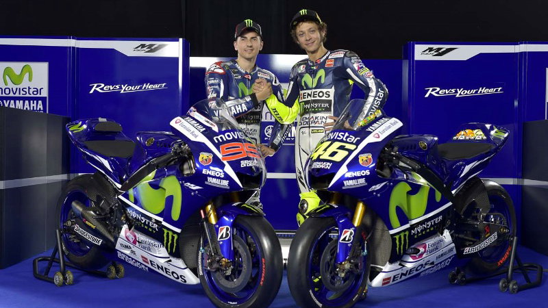 | Valentino Rossi and Jorge Lorenzo with 2015 Movistar Yamahas. |