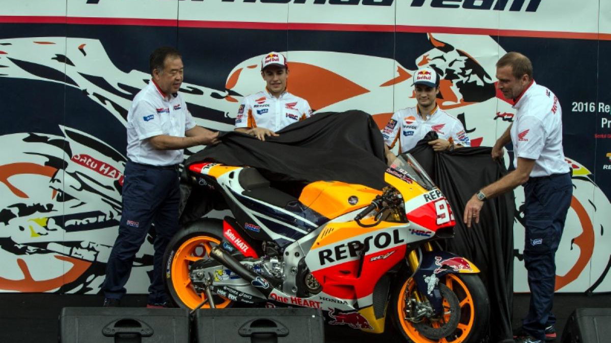 Repsol Honda stars Marc Marquez and Dani Pedrosa unveiled the team's 2016 MotoGP livery during a Valentine's day launch at the Sentul circuit, near Jakarta.