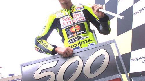 Following victories in both the 125cc and 250cc classes the chance of making history fell to the Italian prodigy, Valentino Rossi, in the premier 500cc class. At Honda's home circuit of Suzuka, in Japan, Rossi won a hard fought race achieving the landmark 500th Motorcycling Grand Prix win.