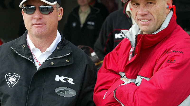 One such person is triple 500cc World Champion Kenny Roberts (pictured with Randy Mamola), Owner of the Proton KR team, who will take part in a demonstration race in a 600cc rally kart against a surprise car star!