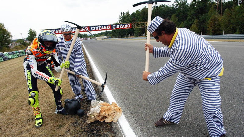 "That pass on Martinez went through my mind as I went for Sete, and this victory is like the same sensation," said Rossi, who in one of the most bizarre post race celebrations - even by his standards - dressed up as a prisoner (complete with ball and chain) and began beating a rock with a pick axe - a response to recent criticism in the Italian press.