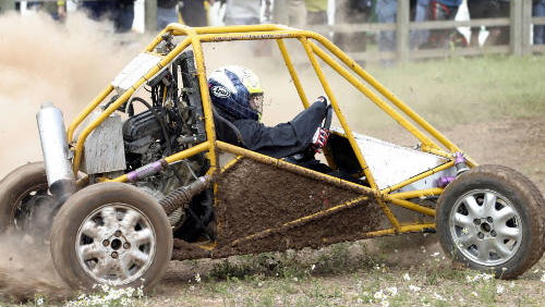 The HotBuggy is a single-seat, high-performance kart designed by WRC engineers and powered by a 600cc motorcycle engine. It produces 100bhp and weighs only 350kg for a similar power-to-weight ratio as a WRC car.