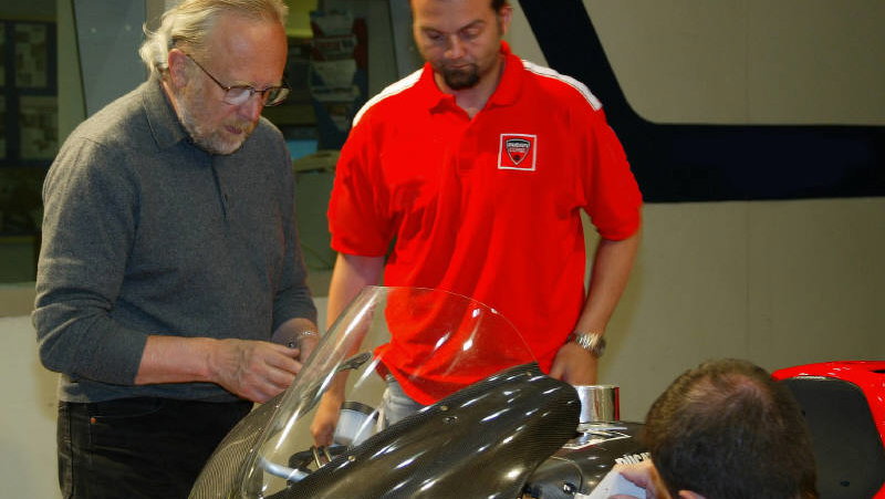 During each UK visit, new bodywork parts, produced by a fast-prototyping 3D machine, are fitted and evaluated. Most tests are conducted with Ducati Marlboro test rider Vittoriano Guareschi on board, since the rider is a vital part of the aerodynamic package, though sometimes a dummy is used. Race riders Loris Capirossi and Carlos Checa join the tests a couple of times a year.