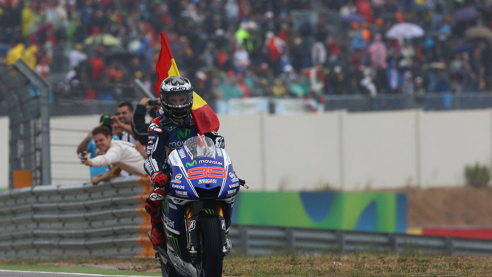 Lorenzo had battled with Marc Marquez and Dani Pedrosa for much of the race, but the Honda riders stayed out too long on slick tyres and fell!