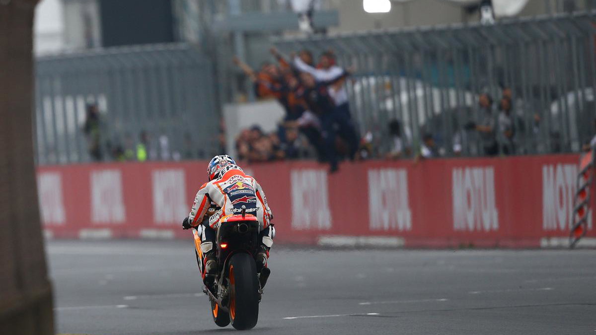 Lorenzo dominated the first half of the race, with Rossi three-seconds behind. But both Yamaha riders began to struggle with front tyre wear, leaving them defenseless against a charging Pedrosa.