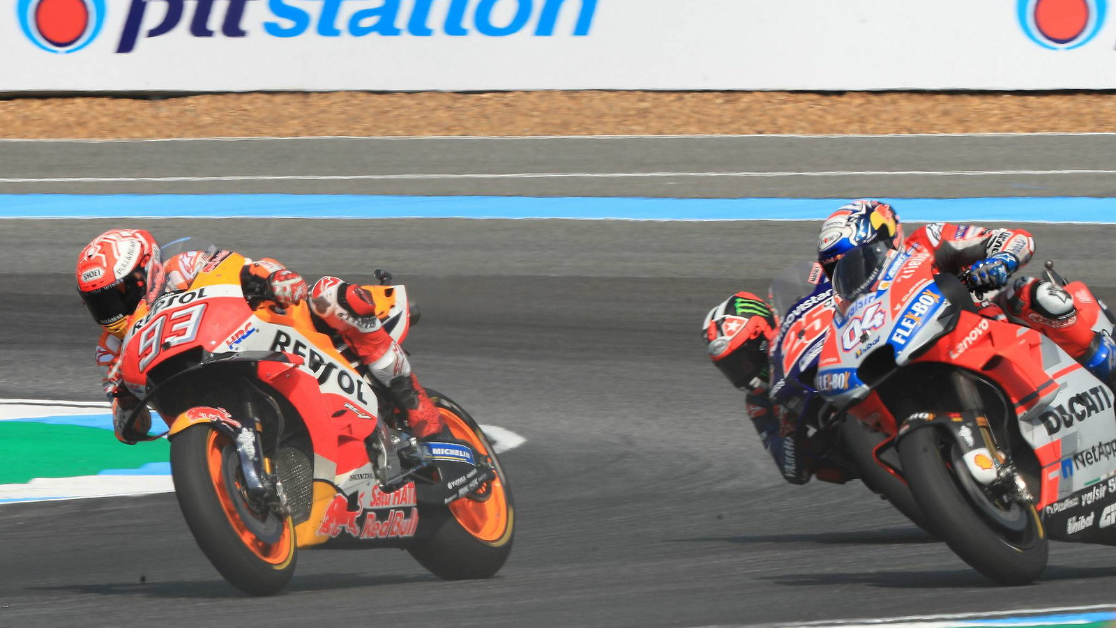 Marquez wins the inaugural Thai MotoGP at Buriram after a last-turn showdown with Dovizioso, as Yamaha riders Vinales and Rossi complete a close lead group after a thrilling race at the front.